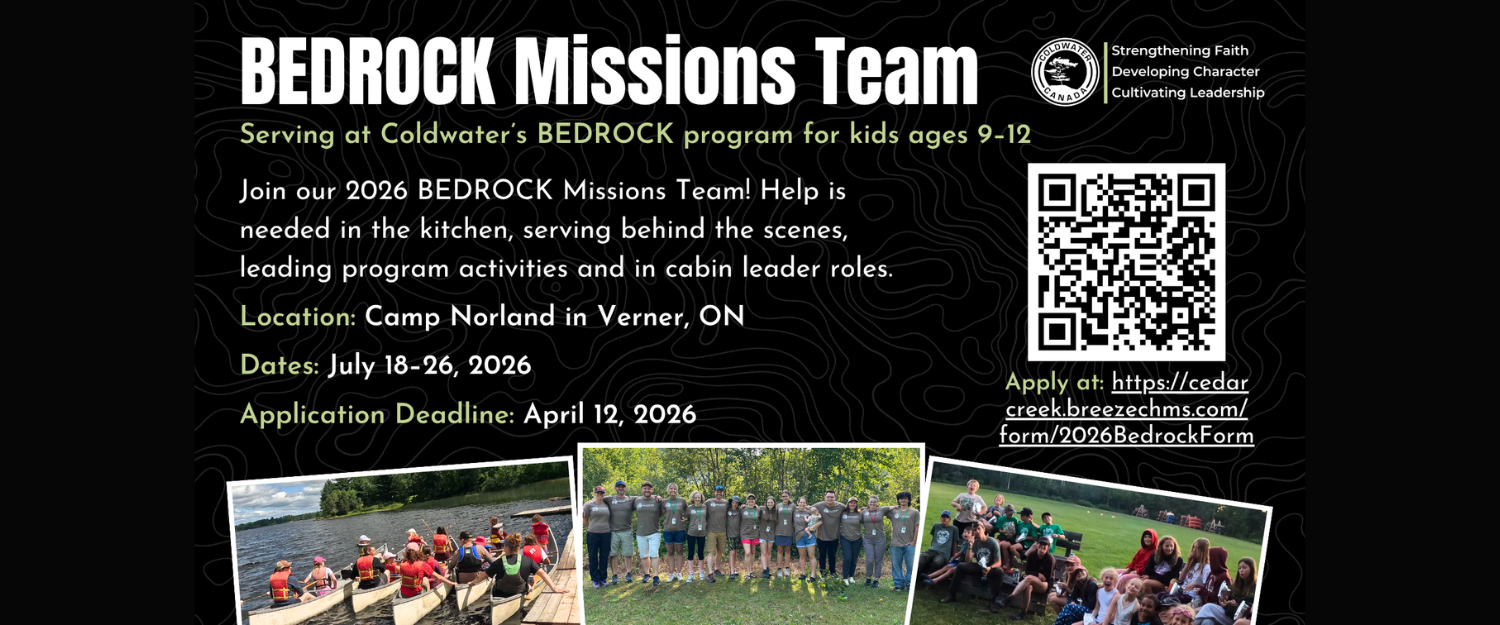 Join the Cedar Creek Bedrock Team this summer for a short-term mission trip to Camp Norland in support of Coldwater Canada. You will have an opportunity to use your unique spiritual gifts to serve elementary school-age youth as they get a taste of wilderness camping while learning about the God who made all that we see.