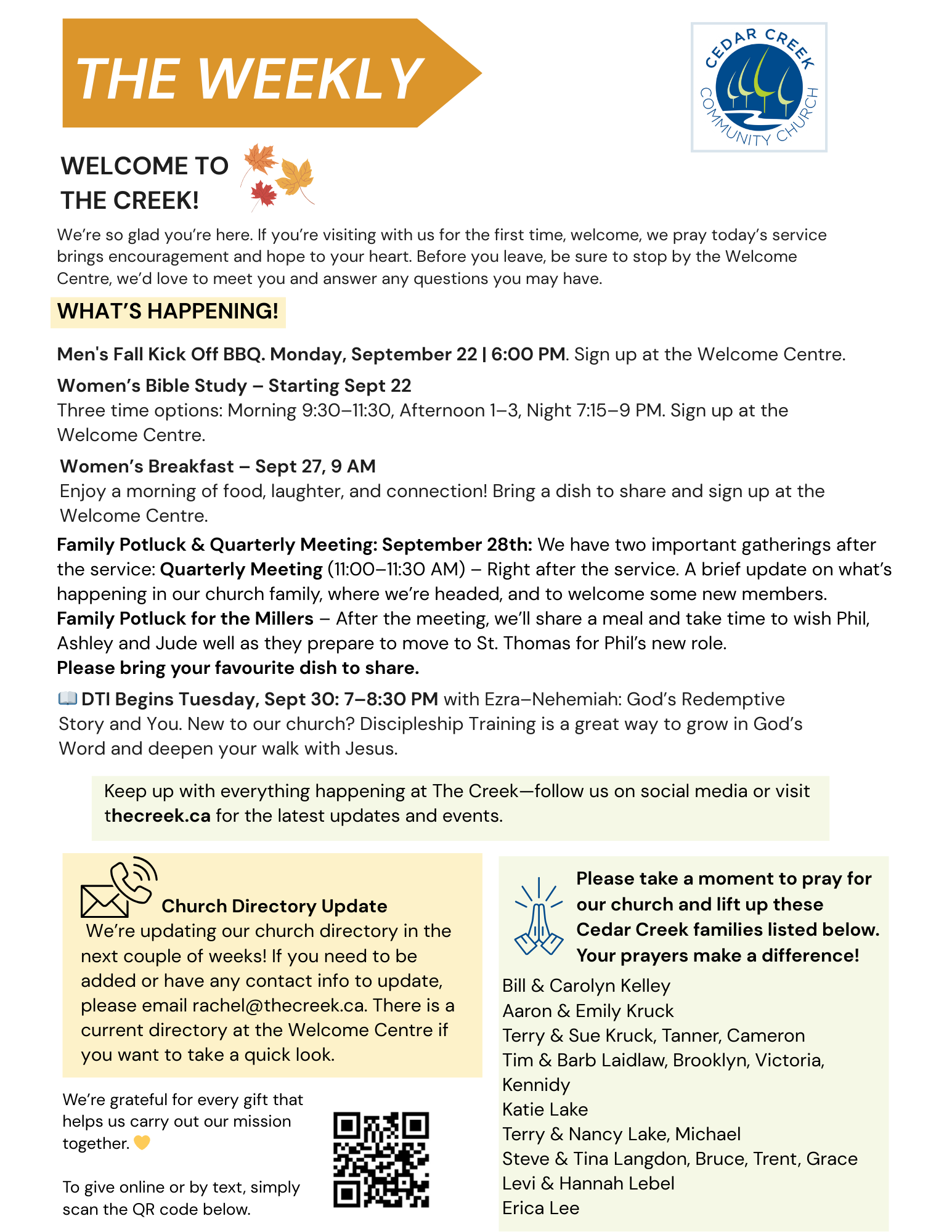 We love sharing what God is doing in and through our church family here at The Creek. The Weekly is your inside look at all the events, ministries, and opportunities happening in our community. It’s more than just updates, it’s a way to stay connected, encouraged, and growing together in faith.