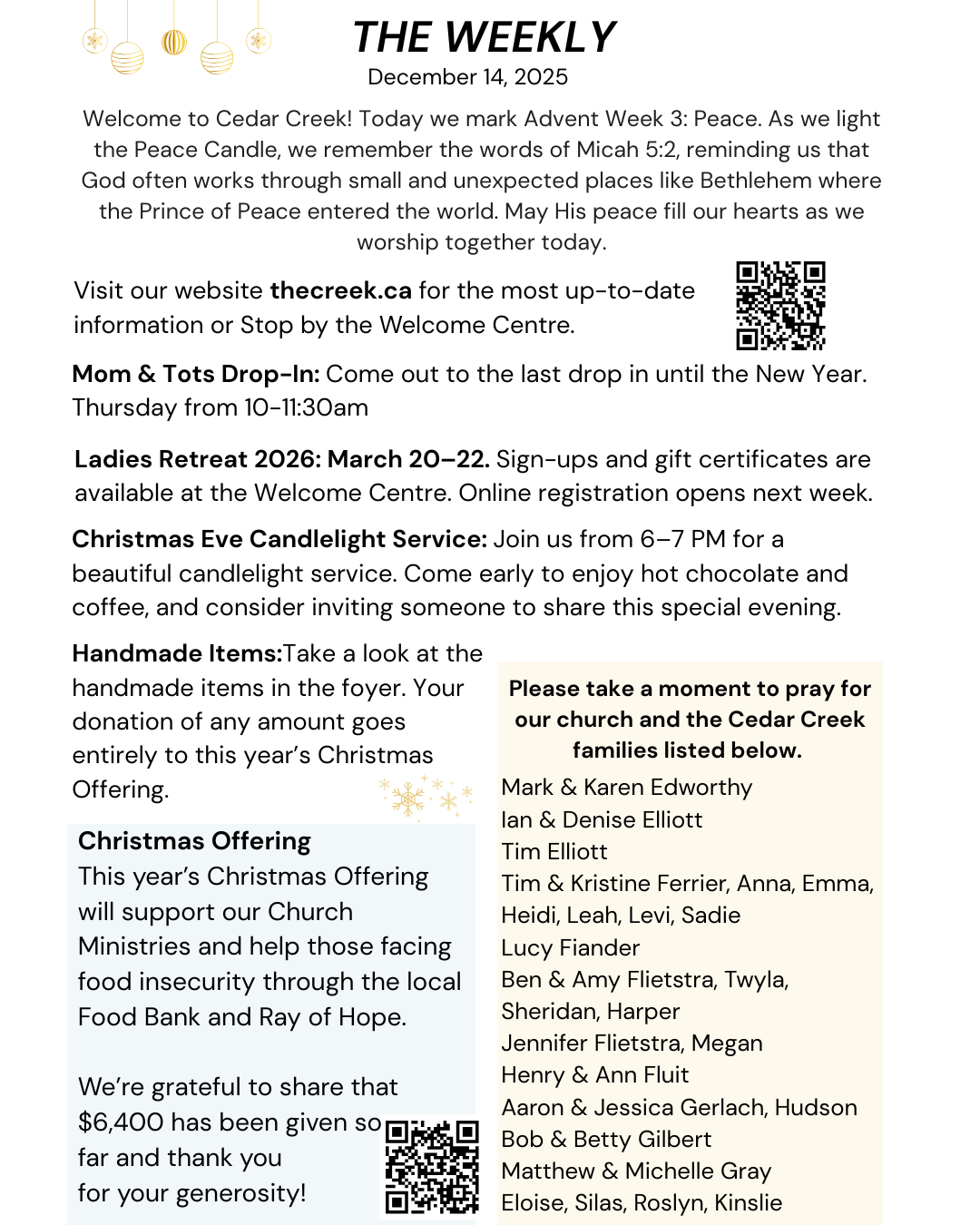 Each Sunday, The Weekly helps you stay in the loop with what’s happening at The Creek—events, giving opportunities, and ways to get connected.